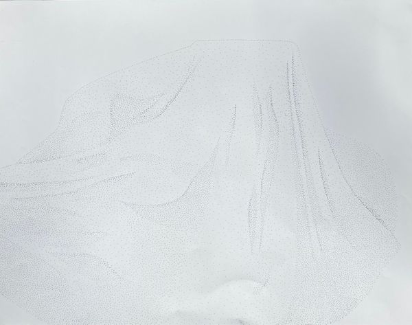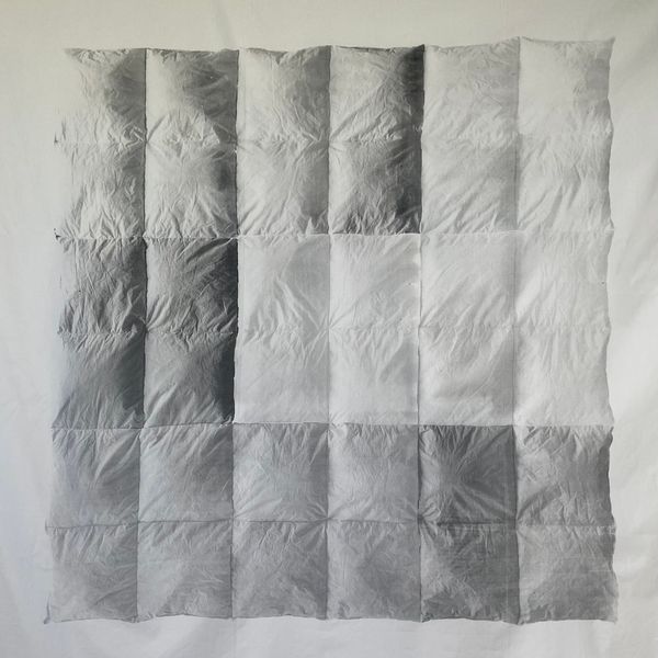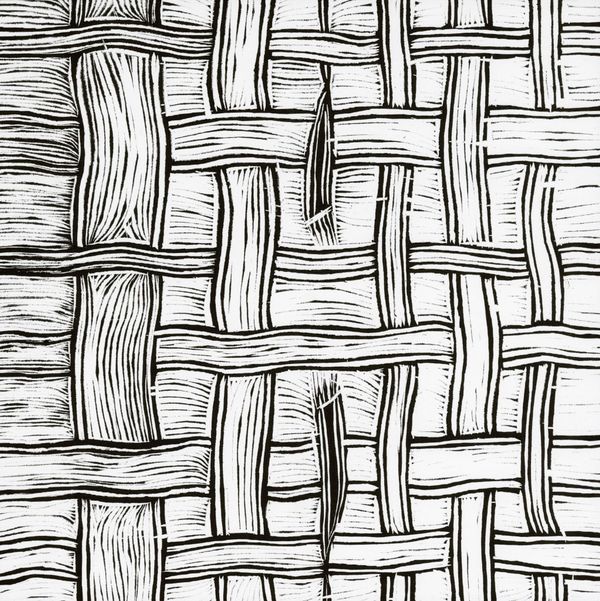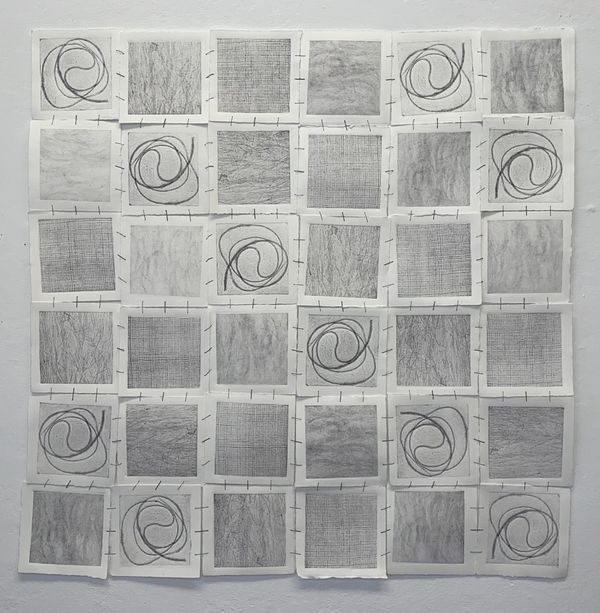 handled, 2022. Carbon paper collagraph prints of grass, twine, burlap, and hair, stitched together.