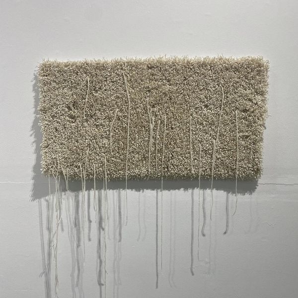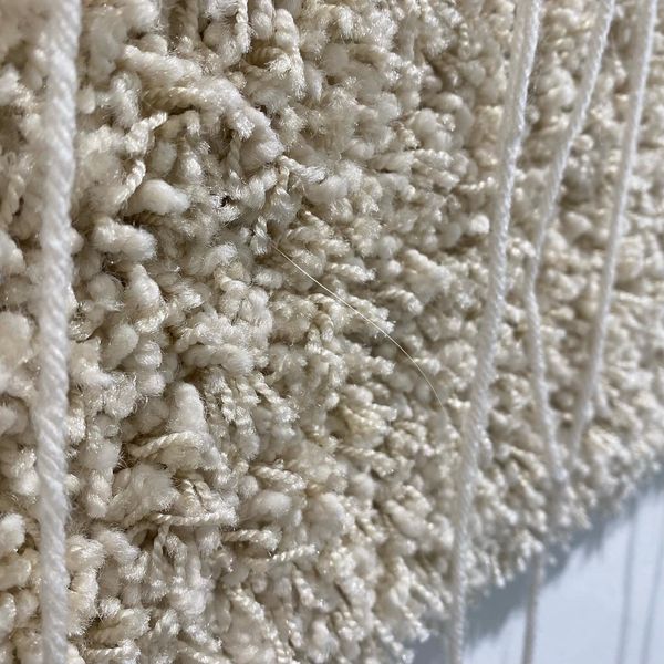 compulsory discoveries so the world doesn't kill me or those i love, 2023. Carpet, yarn, found cat whiskers.