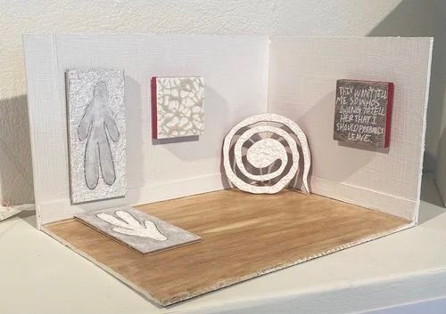 i should probably leave, 2022. Wood, acrylic, string gel, pumice medium, graphite, magnets.