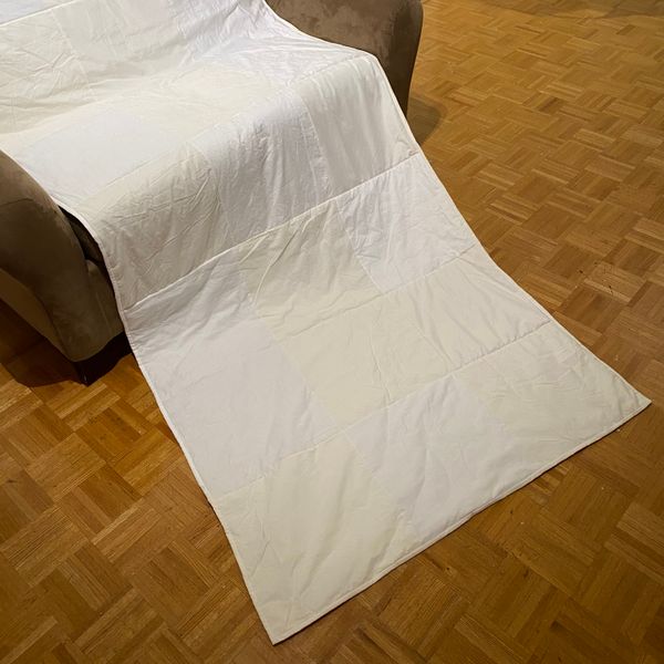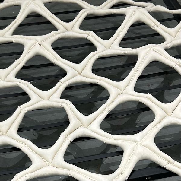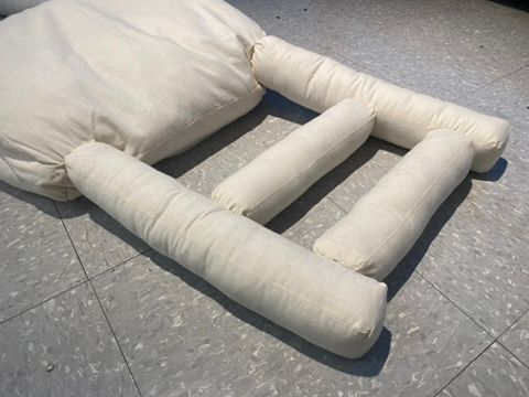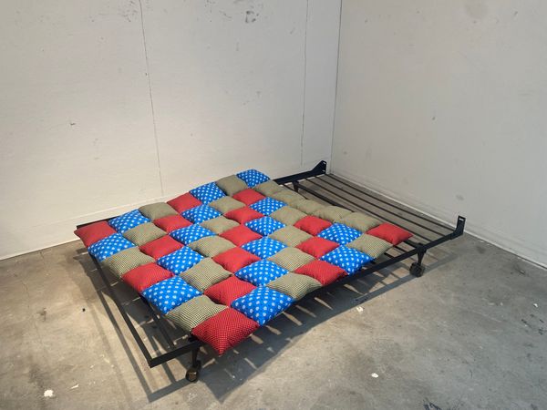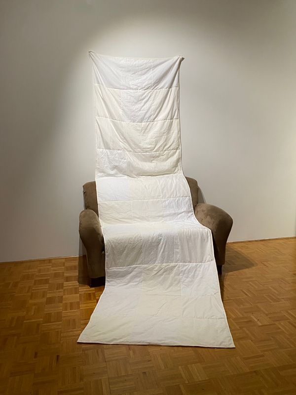 couchsurfing, 2025. Couch, bedsheets, batting, thread.